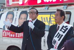 出迎えて下さった支持者の皆さんに心からの御礼のあいさつをする白川候補。後の街宣車では、森ゆうこ参議院議員が熱い白川支援の訴えをしておられる。森ゆうこさんには、本当にお世話になりました。3年半後の森さんの選挙の時にはこのお返しをしっかりとしなければならないと白川陣営は肝に銘じております。