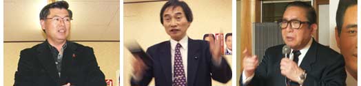 日中の強行日程の街頭演説会に続いて、午後6時半から開かれた4ヶ所の個人演説会でも熱弁で白川候補への支援を訴える佐藤信幸県議会議員(長岡市選出・民主党)、長部登県議会議員、渡辺秀央参議院議員(左から)