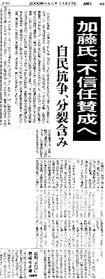 舞台回しは、加藤氏にますます有利に回っています。野中幹事長が高圧的に出ればでるほど、加藤氏のいっていることに対する国民の理解は深まり、自民党がもうどうにもならないほど時代遅れの政党であることを白日のもとに曝けだすだけです。いま、「森の中の青き亀」執行部の大義は、野党が出す不信任案に賛成するという形式的な非を訴えることしかありません。しかし、国民は、自民党という政党が政権党であることの正統性すら疑いだしているのですから、その政党の形式的な正統性に過ぎない党規約をもちだしてきても、国民の共感を得ることはまったくできないでしょう。